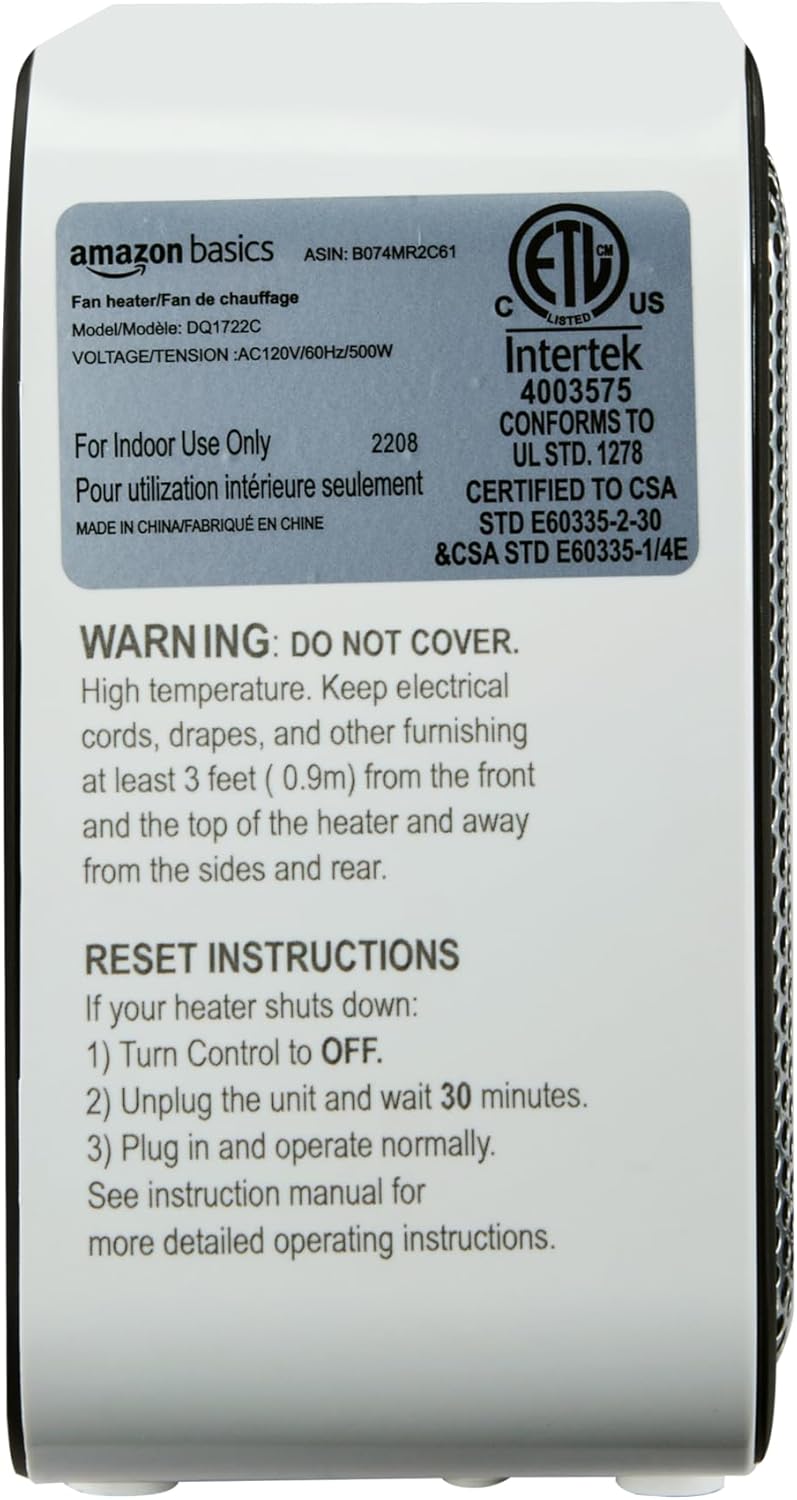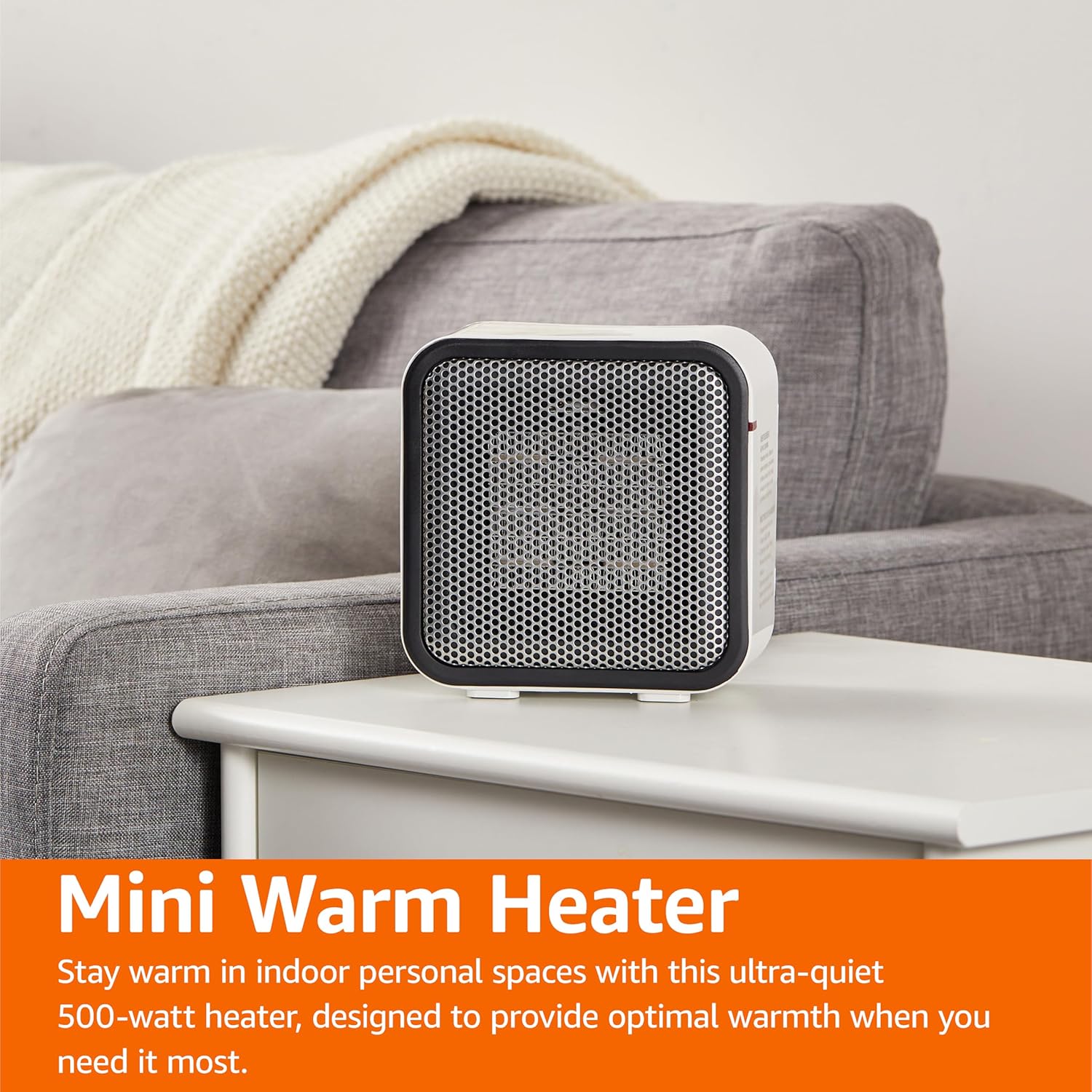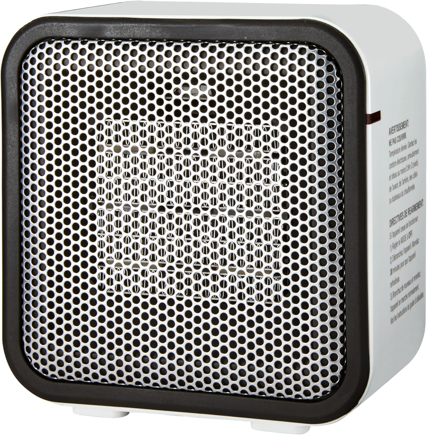 Amazon Basics Ceramic Space Heater, Mini Heater for Office Desk, Portable Tent Heater for Camping (Indoor Use), With Tip-Over Protection, Lightweight (1.4 LBS), White, 5.8"D x 3.4"W x 6"H
