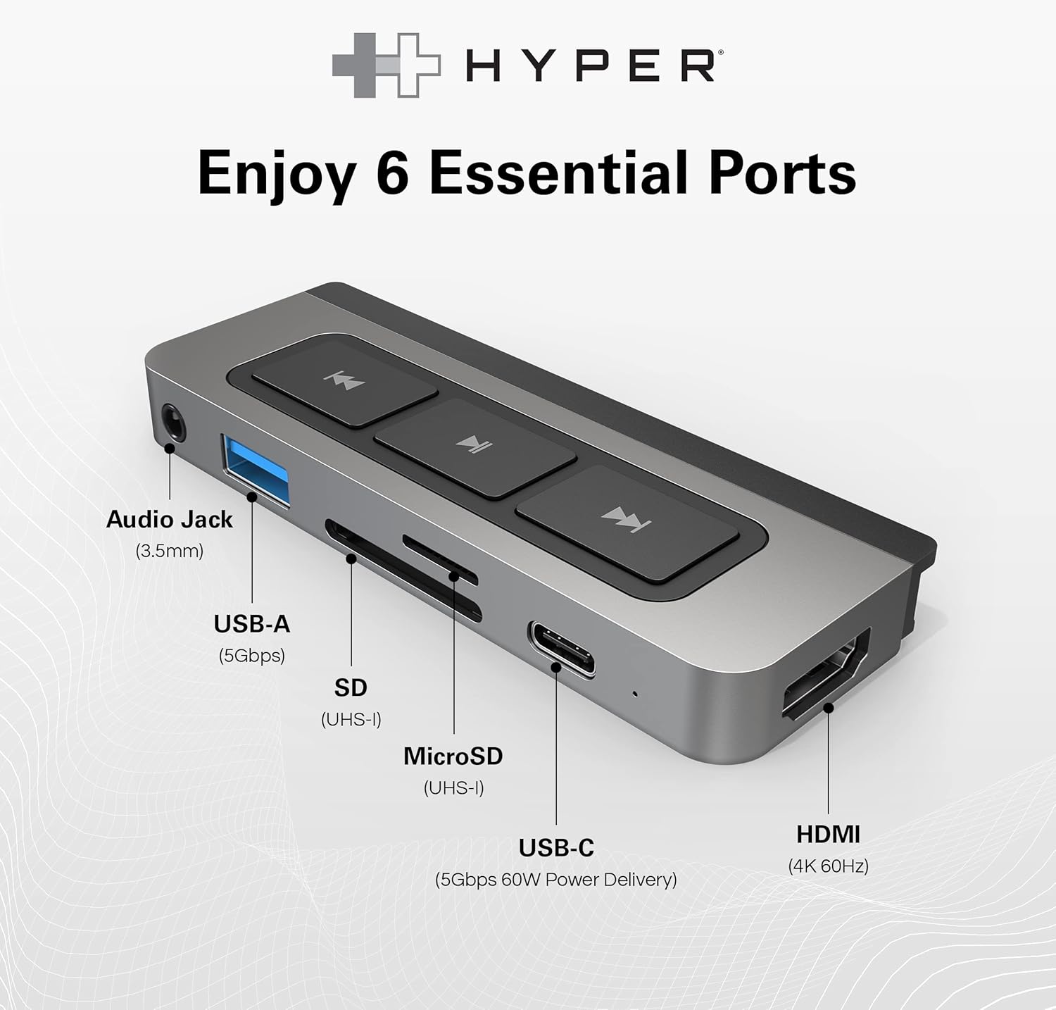 HyperDrive 6-in-1 USB-C Hub with Media Shortcut Buttons for iPad